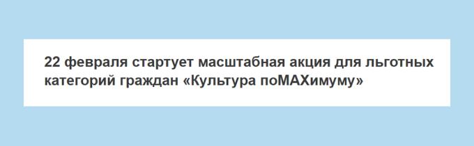 Комитет по социальной политике Санкт-Петербурга информирует, что Министерство труда и социальной защиты Российской Федерации совместно с Министерством культуры Российской Федерации запустили акцию для льготных категорий граждан - "Культура по MAХимуму".