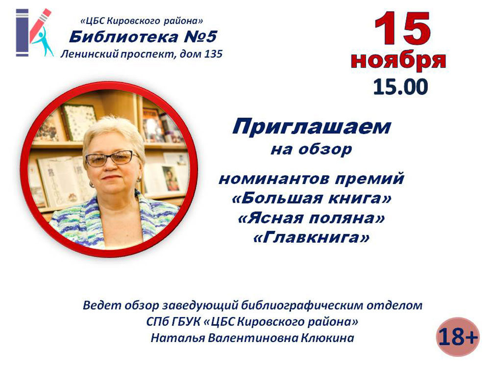В этом году литературные премии предоставляют читателям пространство для выбора. В списки вошли авторы, кто пишет уже тридцать лет, и авторы, которых всё еще называют дебютантами, познакомиться с которыми поможет заведующий библиографическим отделом СПб ГБУК "ЦБС Кировского района" Наталья Валентиновна Клюкина.