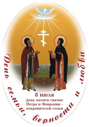 Петр и Феврония - русские православные святые. Почитаются в России как покровители семьи и брака. Их супружеский союз считается образцом христианского брака. Пётр и Феврония были канонизированы на церковном соборе 1547 года в качестве местночтимых святых. Днём их памяти является 25 июня (8 июля); 25 декабря 2012 года Священный Синод установил ещё одно празднование святым - в воскресенье перед 6 (19) сентября (перенесение их мощей в 1992 году).
