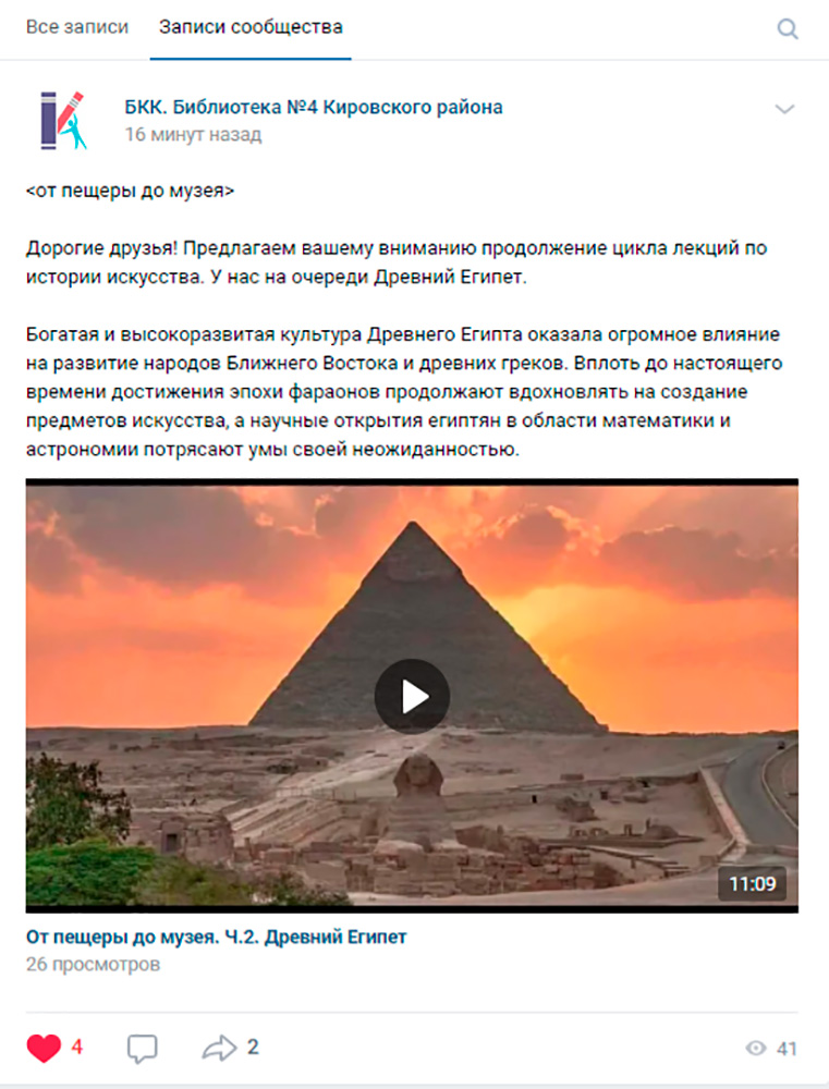 19 марта в группе Библиотечно-культурного комплекса им. А. В. Молчанова ВКонтакте состоялся показ второй онлайн-лекции по искусству из цикла "От пещеры до музея". На этот раз темой лекции стало самобытное искусство Древнего Египта, ведь эта древнейшая цивилизация во многом предвосхитила время, а богатая и высокоразвитая культура Древнего Египта оказала огромное влияние на развитие народов Ближнего Востока и древних греков.