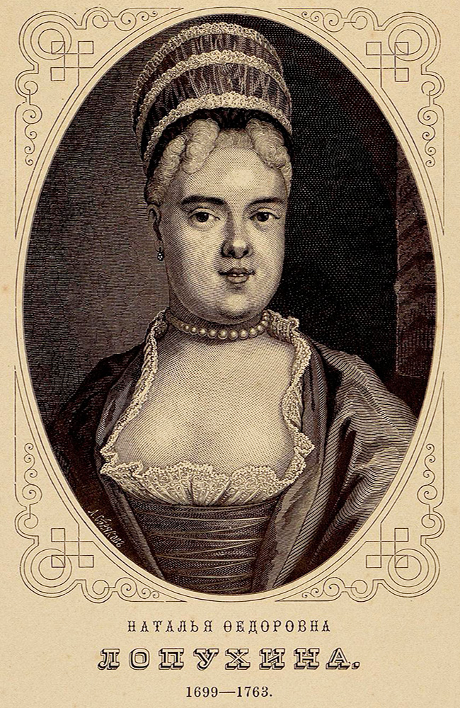Наталья Лопухина славилась своей красотой, была известна как светская женщина, любительница балов, модница, сплетница. Это была женщина, знавшая цену людям и себе. Благодаря ее интригам, продвигался по служебной лестнице и муж, семья получила значительные земельные владения.