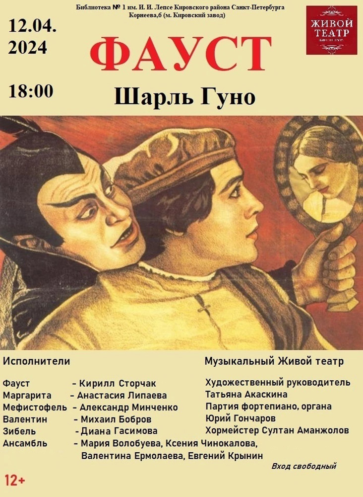 Библиотека №1 им. И. И. Лепсе приглашает на концертное исполнение номеров из оперы Шарля Гуно "Фауст". Постановка Санкт-Петербургского Музыкального "Живого театра".
