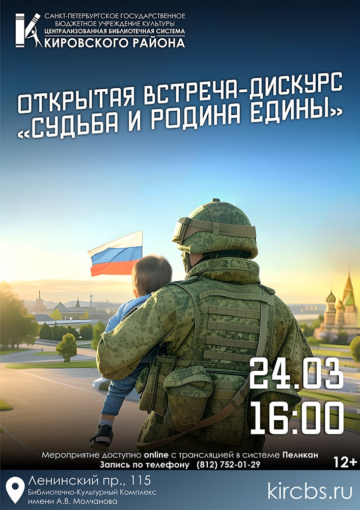 24 марта в 16.00 в Библиотеке №4 (Библиотечно-культурном комплексе) имени А. В. Молчанова пройдет очередная встреча в рамках патриотического цикла "Судьба и Родина едины". Организаторами проекта выступают Совет ветеранов Кировского района, Централизованная библиотечная система Кировского района и Ассоциация ветеранов СВО "Защитники Родины".
