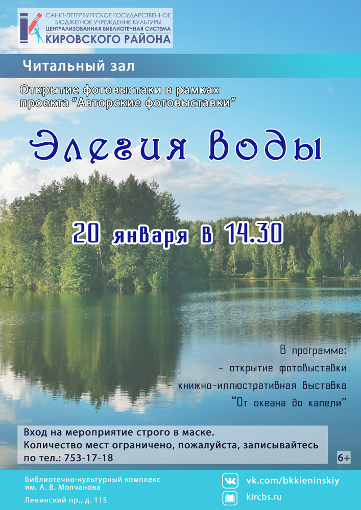 20 января в 14.30 в читальном зале Библиотечно-культурного комплекса им. А. В. Молчанова состоится Открытие фотовыставки "Элегия воды" в рамках проекта "Авторские фотовыставки".