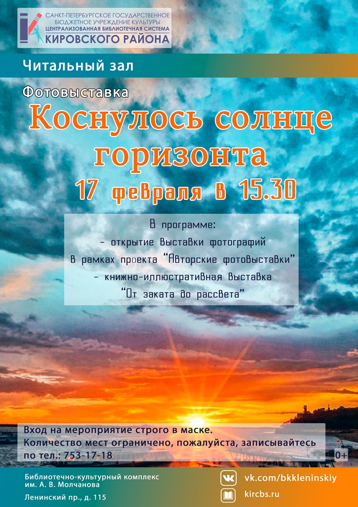 17 февраля в 15.30 в читальном зале Библиотечно-культурного комплекса им. А.В.Молчанова, в рамках проекта "Авторские фотовыставки", состоится открытие фотовыставки "Коснулось солнце горизонта".