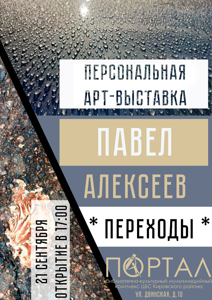 21 сентября в 17.00 в Библиотеке №9 / Библиотечно-культурный мультимедийный комплекс "Портал" (ул. Двинская, д. 10) состоится торжественное открытие персональной фотовыставки "Переходы" поэта, прозаика, члена Союза писателей Санкт-Петербурга Павла Алексеева.