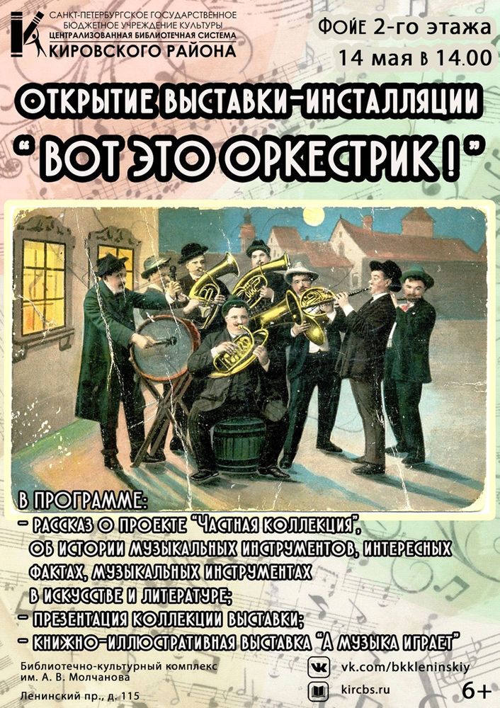 14 мая в 14.00 в холле 2 этажа Библиотечно-культурного комплекса им. А. В. Молчанова (Ленинский пр., д. 115) состоится Открытие вставки-инсталляции "Вот это оркестрик!"