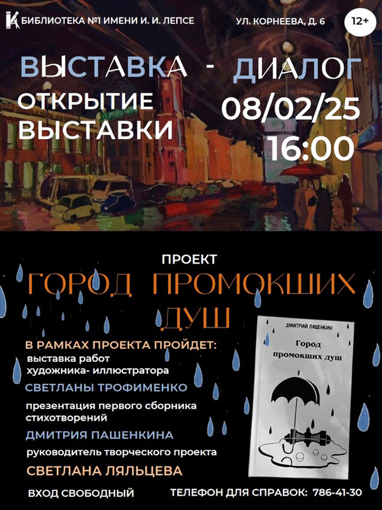 Библиотека №1 им. И. И. Лепсе приглашает на Открытие выставки "Выставка - диалог" художника-иллюстратора Светланы Трофименко и презентацию первого сборника стихотворений Дмитрия Пашенкина из проекта "Город промокших душ".