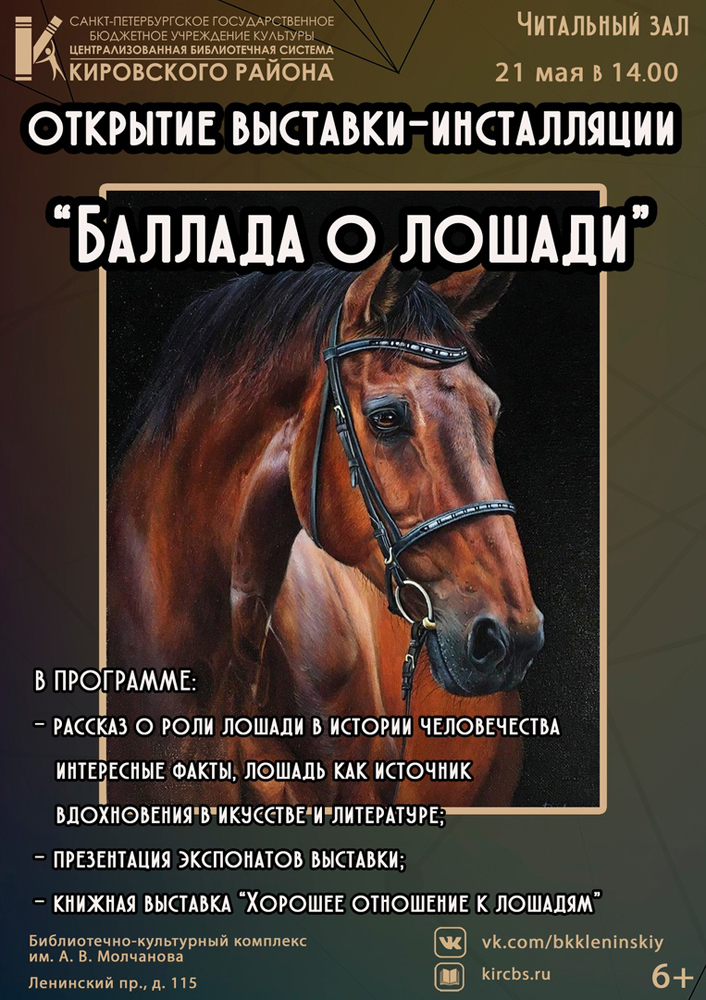 21 мая в 14.00 в Читальном зале Библиотечно-культурного комплекса им. А. В. Молчанова (Ленинский пр., д. 115) состоится Открытие выставки-инсталляции "Баллада о лошади".
