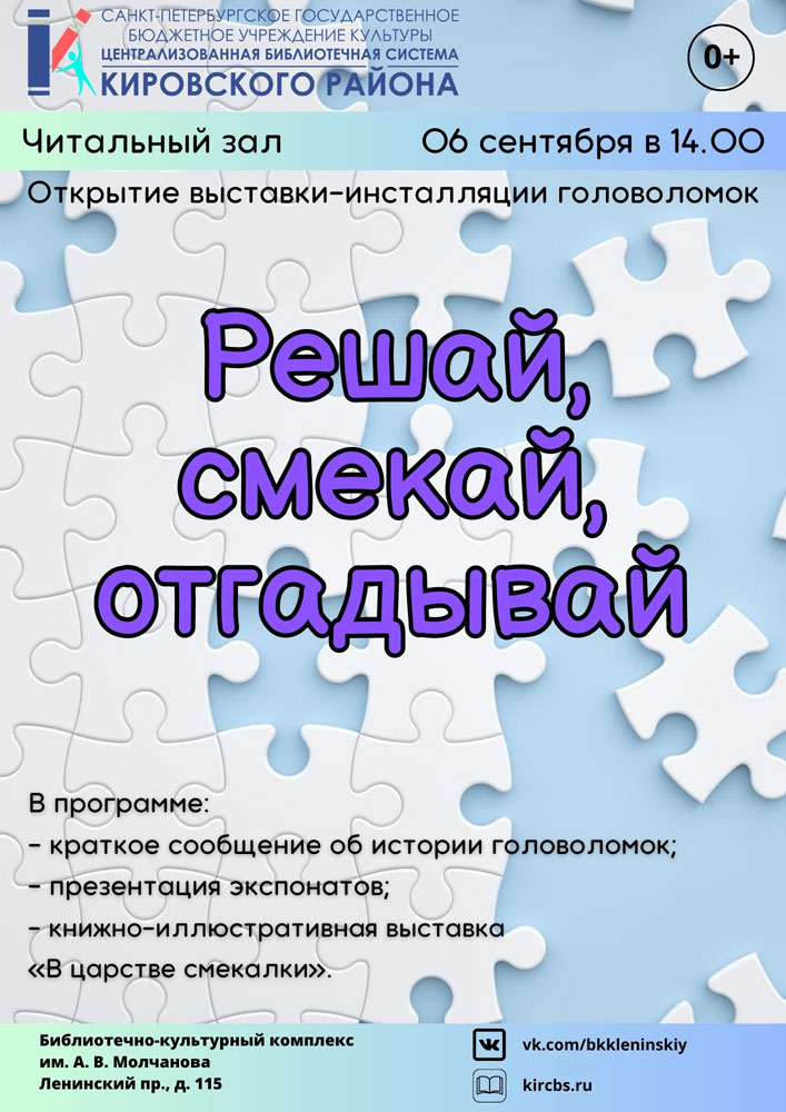 6 сентября в 14.00 в читальном зале Библиотечно-культурного комплекса им. А. В. Молчанова (Ленинский пр., д. 115) состоится Открытие выставки-инсталляции головоломок "Решай, смекай, отгадывай".