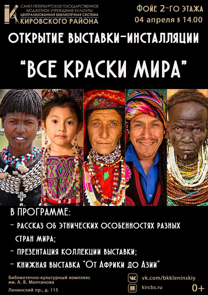 4 апреля в 14.00 в фойе 2 этажа Библиотечно-культурного комплекса им. А. В. Молчанова (Ленинский пр., д. 115) состоится Открытие выставки-инсталляции "Все краски мира".