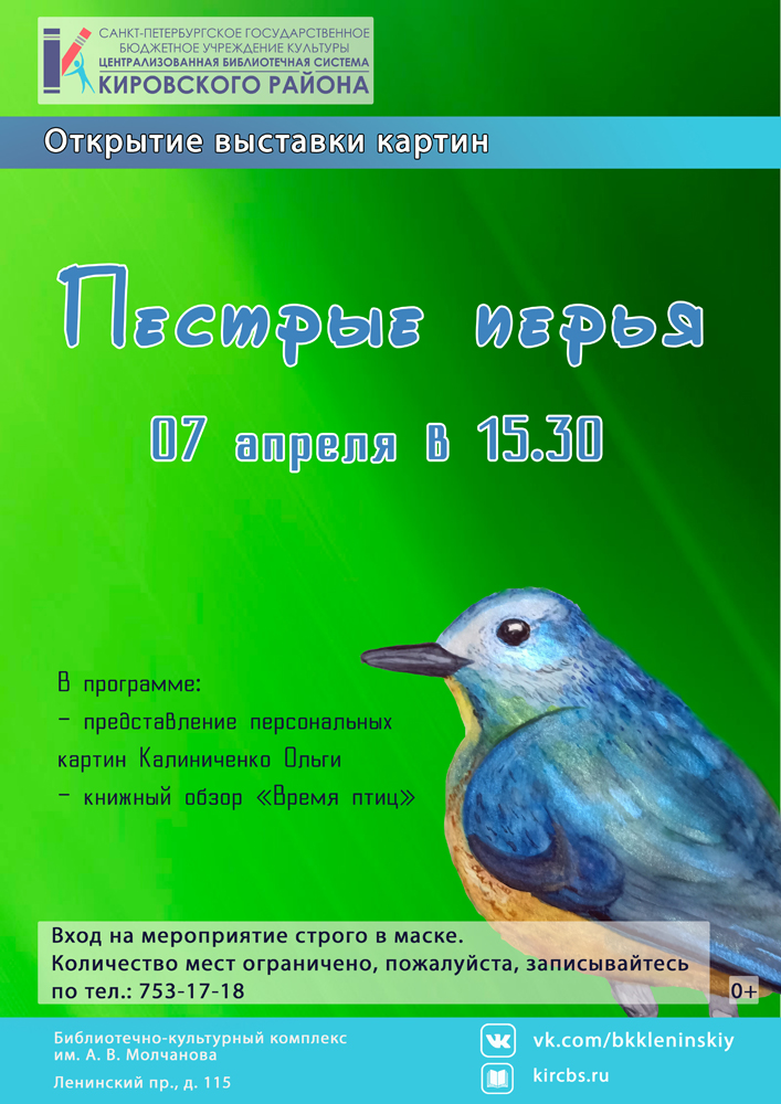 7 апреля в 15.30 в Библиотечно-культурном комплексе им. А. В. Молчанова будет проходить Открытие выставки картин "Пестрые перья".