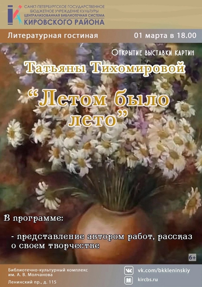 1 марта в 18.00 в Литературной гостиной Библиотечно-культурного комплекса им. А. В. Молчанова (Ленинский пр., д. 115) состоится Открытие выставки картин Татьяны Тихомировой "Летом было лето". Гостей мероприятия ожидает рассказ о творчестве автора и презентация работ.