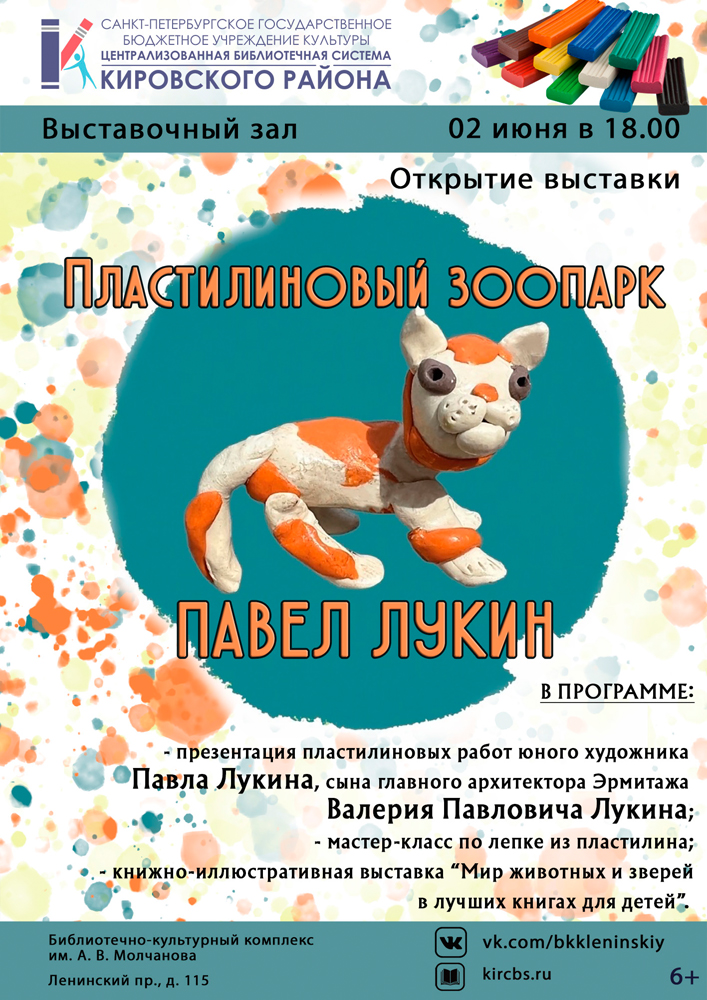 2 июня в 18.00 в Библиотечно-культурном комплексе им. А. В. Молчанова (Ленинский пр., д. 115) состоится Открытие выставки Павла Лукина "Пластилиновый зоопарк".