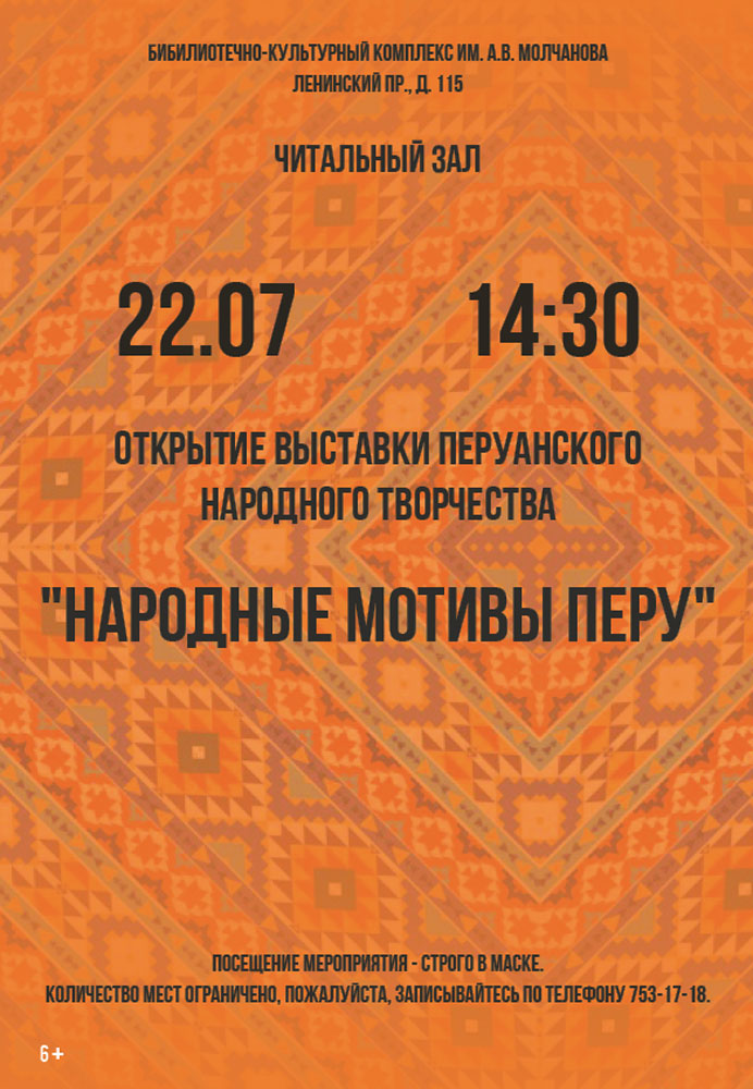22 июля в 14.30 в читальном зале Библиотеки №4 (Библиотечно-культурный комплекс) им. А. В. Молчанова состоится Открытие выставки перуанского народного творчества "Народные мотивы Перу", посвященной 200-летию со дня провозглашения независимости Перу от испанской экспансии (28 июля).