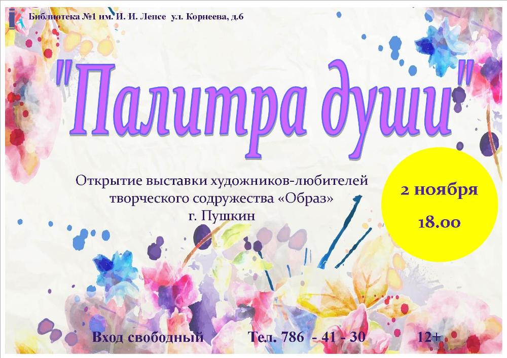 2 ноября 2023 г. в 18.00 Библиотека №1 им. И. И. Лепсе приглашает на открытие художественной выставки художников-любителей творческого содружества "Образ" г.Пушкина.