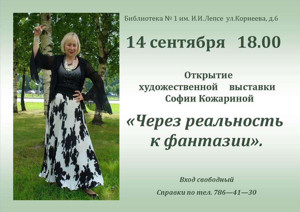 Библиотека №1 им. И. И. Лепсе приглашает всех желающих на Открытие художественной выставки Софии Кожариной "Через реальность к фантазии", на которой представлена живопись и компьютерная графика