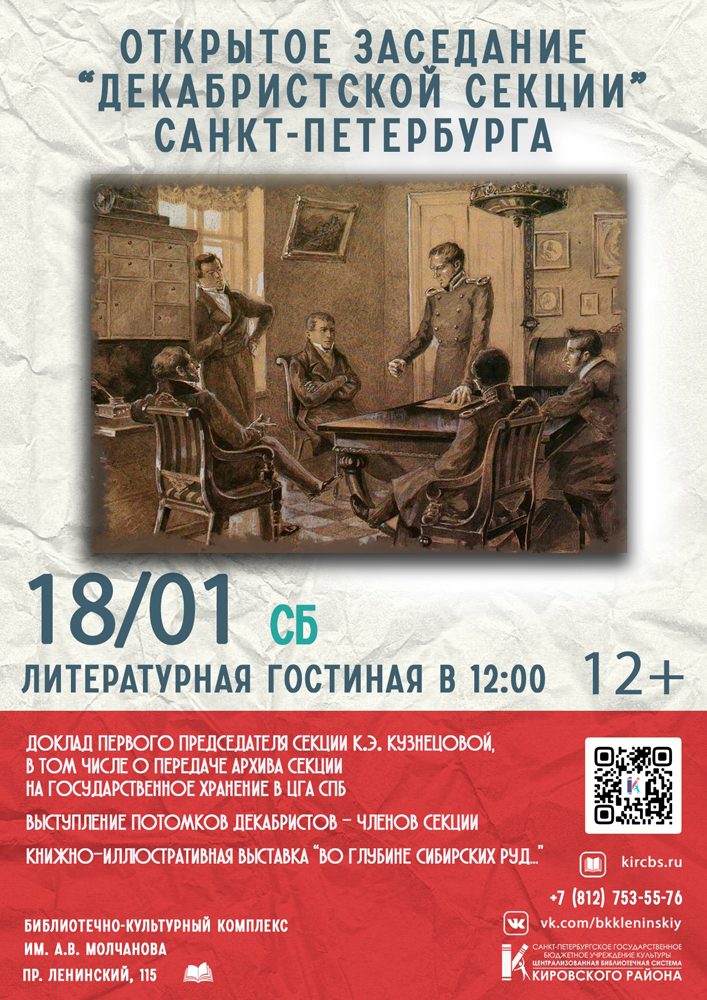 18 января в 12.00 в Литературной гостиной Библиотечно-культурного комплекса им. А. В. Молчанова (Ленинский пр., д. 115) состоится Открытое заседание "Декабристской секции" Санкт-Петербурга.