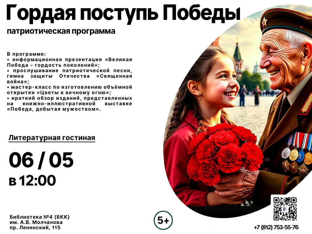6 мая в 12.00 в литературной гостиной Библиотеки №4 (Библиотечно-культурного комплекса) им. А. В. Молчанова (Ленинский пр., д. 115) состоится Патриотическая программа "Гордая поступь Победы".