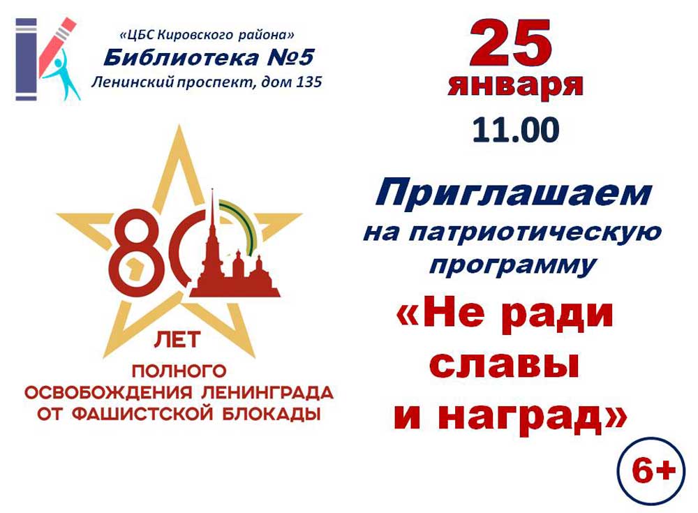Читателей и гостей библиотеки ожидает патриотическая программа "Не ради славы и наград", в рамках которой будет представлена информационная презентация "Легендарный город". Все желающие смогут принять участие в чтении стихотворений о Блокаде Ленинграда.