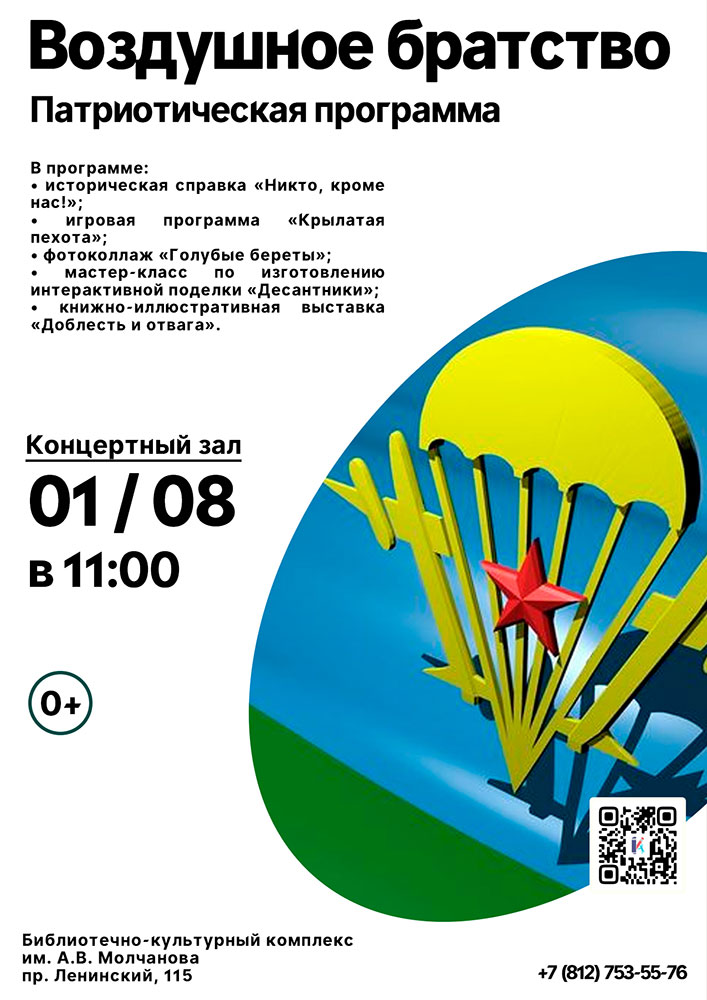 1 августа в 11.00 в Концертном зале Библиотечно-культурного комплекса им. А. В. Молчанова (Ленинский пр., д. 115) состоится Патриотическая программа "Воздушное братство".