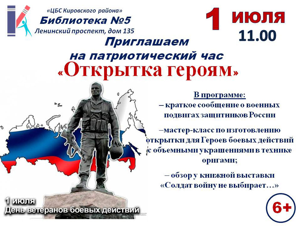 В День памяти ветеранов боевых действий в Библиотеке №5 (Ленинский пр., д. 135) пройдет Патриотический час "Открытка героям".