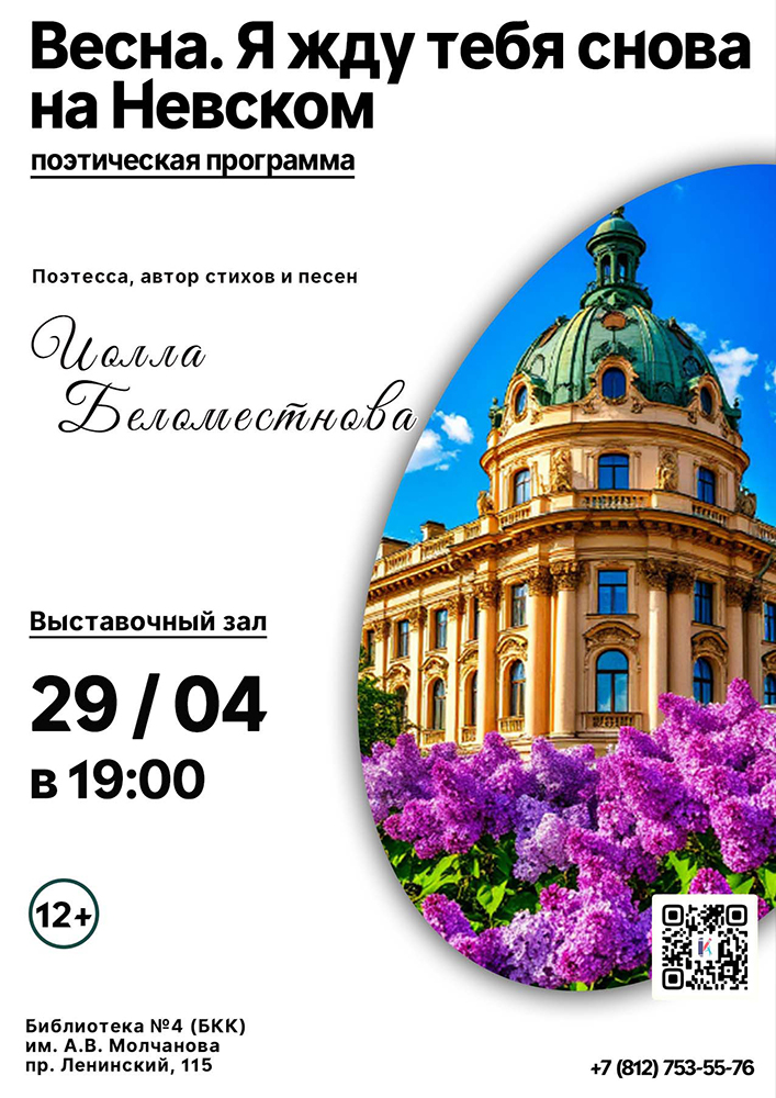 29 апреля в 19.00 в выставочном зале Библиотеки №4 (Библиотечно-культурного комплекса) им. А. В. Молчанова (Ленинский пр., д. 115) состоится Поэтическая программа "Весна. Я жду тебя на Невском".