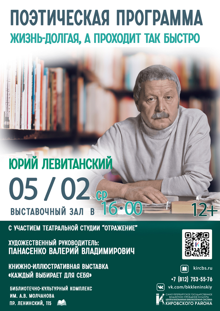 5 февраля в 16.00 в Выставочном зале Библиотечно-культурного комплекса им. А. В. Молчанова (Ленинский пр., д. 115) состоится Поэтическая программа "Жизнь долгая, а проходит так быстро".