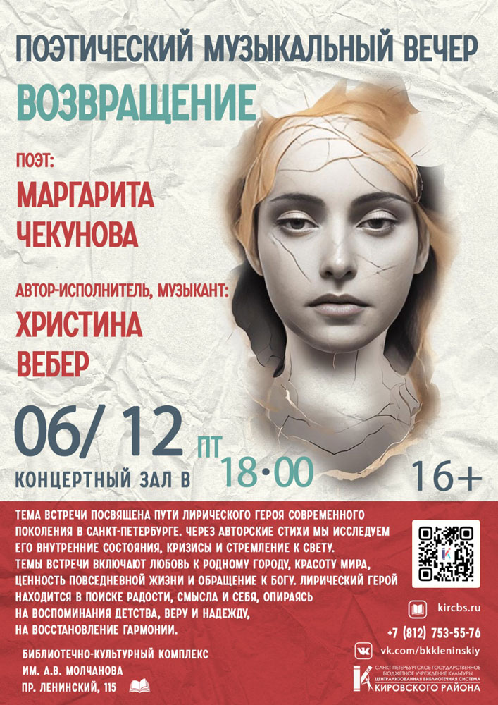 6 декабря в 18.00 в Концерном зале Библиотечно-культурного комплекса им. А. В. Молчанова (Ленинский пр., д. 115) пройдет Поэтический музыкальный вечер "Возвращение".