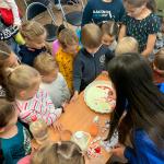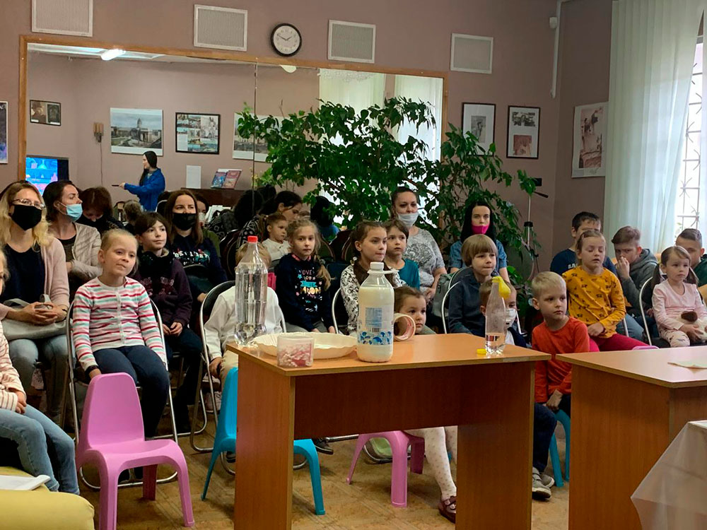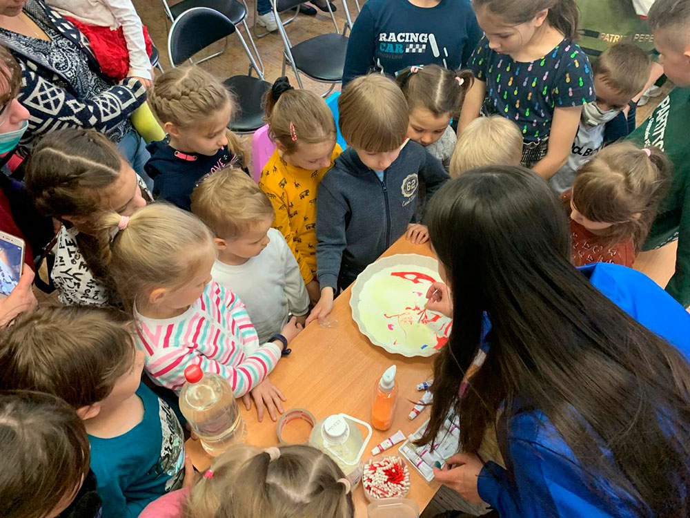 Во второй части мероприятия ребятам продемонстрировали красивые опыты с использованием химических реакций. Всей дружной компанией мы попытались изобразить красивую мраморную картину на молоке, сделали так, чтобы шарик надувался сам без помощи дыхательной системы или насоса! С использованием соды и лимонной кислоты мы сделали пенные вулканы, а перекись водорода и дрожжи превратились в еще более красочную пену!