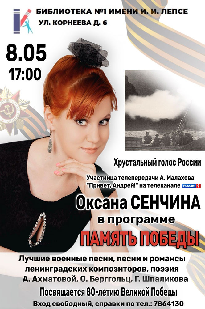 Библиотека №1 им. И. И. Лепсе (ул. Корнеева д. 6) приглашает на Праздничную программу "Память Победы", посвященную 80-летию Великой Победы.