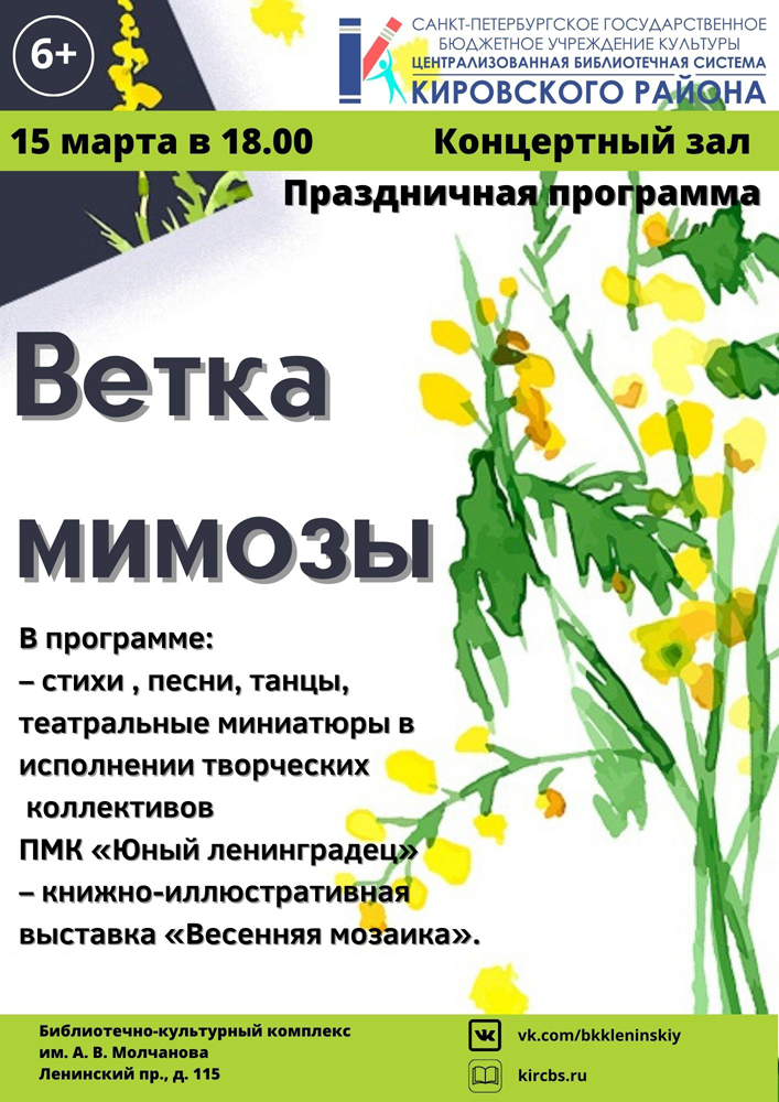 15 марта в 18.00 в концертном зале Библиотечно-культурного комплекса им. А. В. Молчанова состоится Праздничная программа "Ветка мимозы".