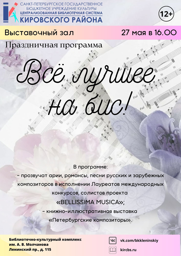 27 мая в 16.00 в выставочном зале Библиотечно-культурного комплекса им. А. В. Молчанова состоится Праздничная программа "Всё лучшее на бис!".