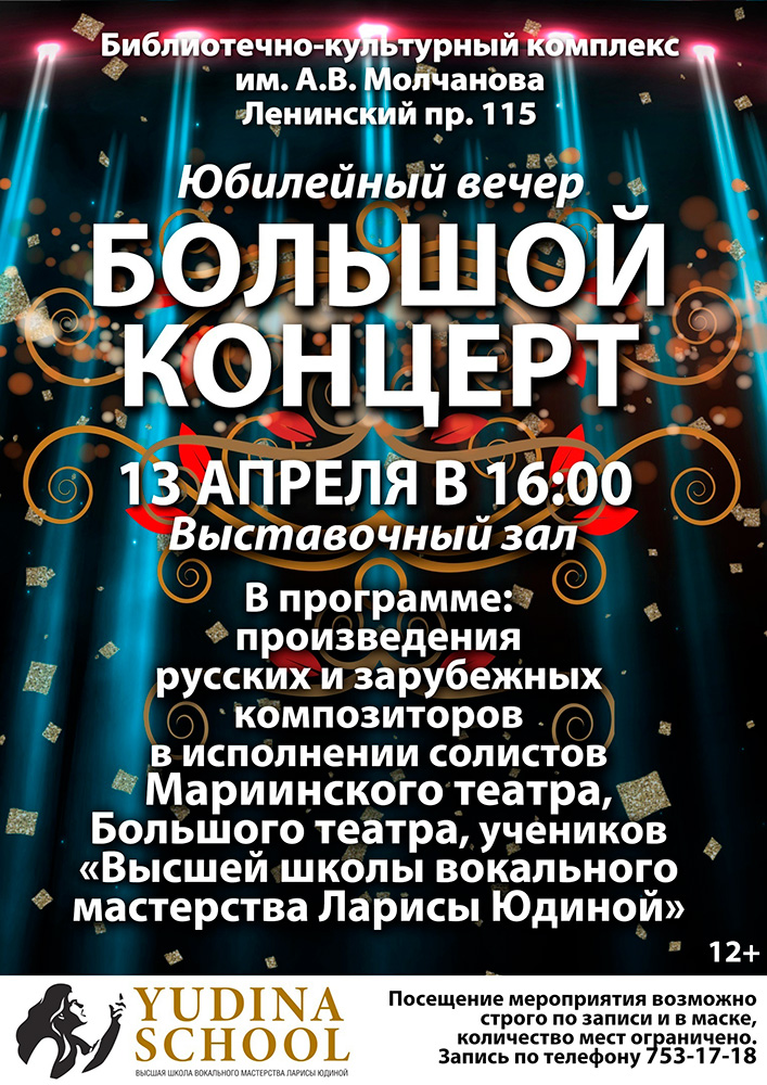 13 апреля 2021 года в 16.00 в выставочном зале Библиотеки №4 (Библиотечно-культурный комплекс) имени А. В. Молчанова состоится Праздничный вечер "Большой концерт", посвященный юбилею "Высшей школы вокального мастерства Ларисы Юдиной".