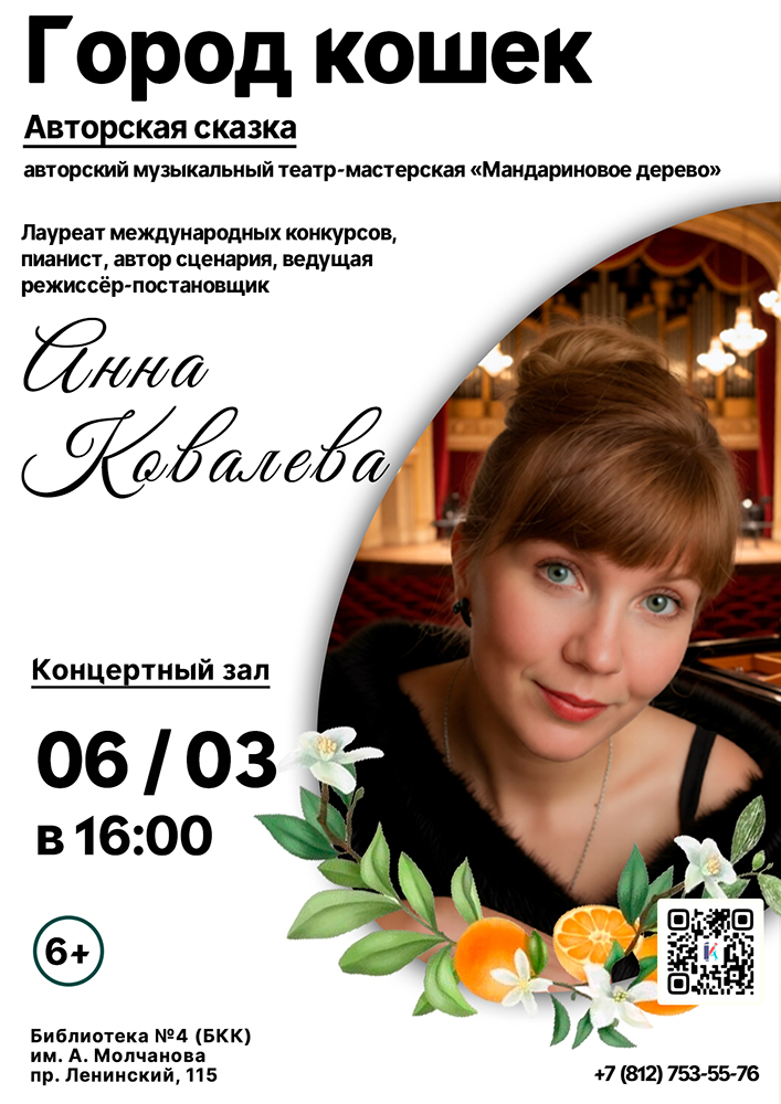 6 марта в 16.00 в Концертном зале Библиотеки №4 (Библиотечно-культурного комплекса) им. А. В. Молчанова (Ленинский пр., д. 115) состоится Презентация авторской сказки "Город кошек" в исполнении авторского музыкального театра-мастерской "Мандариновое дерево".