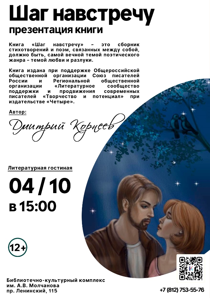 Дорогие друзья! Приглашаем вас на презентацию нового поэтического сборника Дмитрия Корнеева "Шаг навстречу". Книга представляет собой сборник стихотворений и поэм, объединённых главной темой – любовью и разлукой. Внутри неё вы найдёте искренние и глубокие размышления о том, как один неверный шаг может изменить судьбу, и как порой необходимо отбросить гордость, чтобы сохранить самое дорогое.
