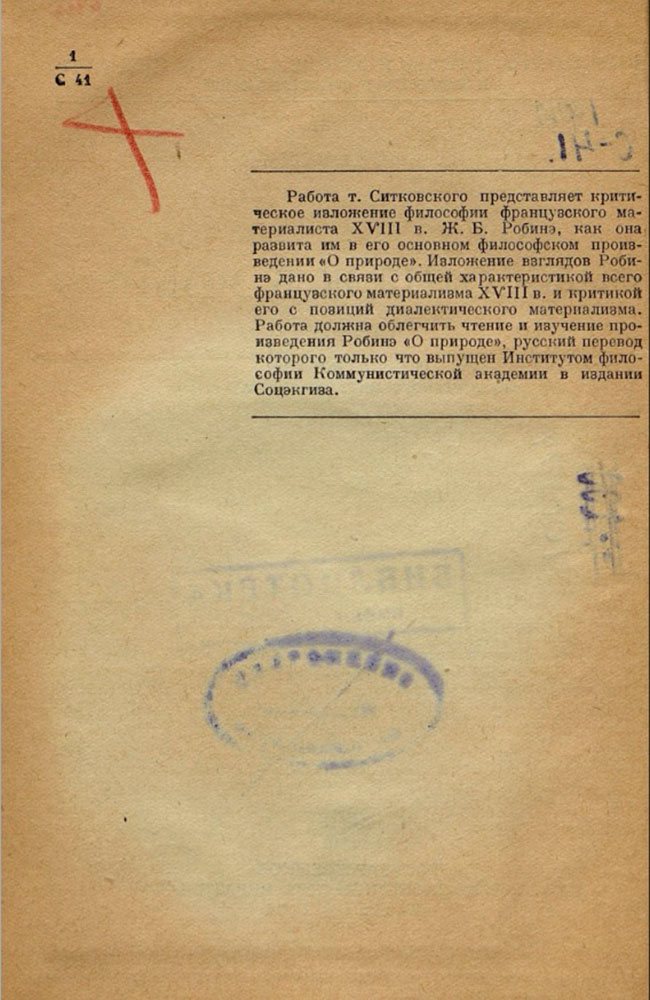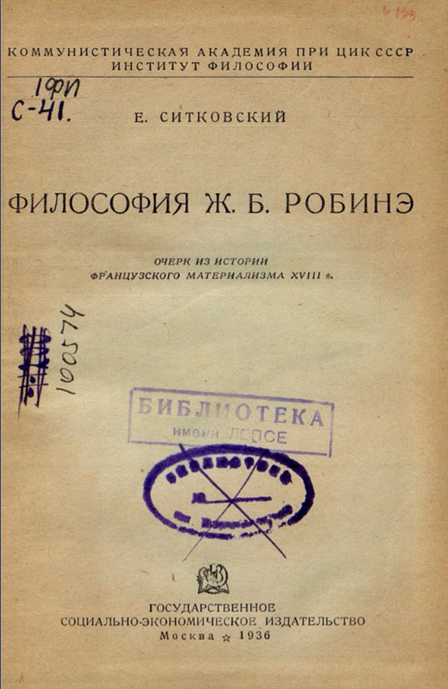 Копия книги Евгения Ситковецкого "Философия Ж. Б. Робинэ": очерк из истории французского материализма XVIII в. (1936) в формате pdf весит 159 Мб, в ней 230 страниц.