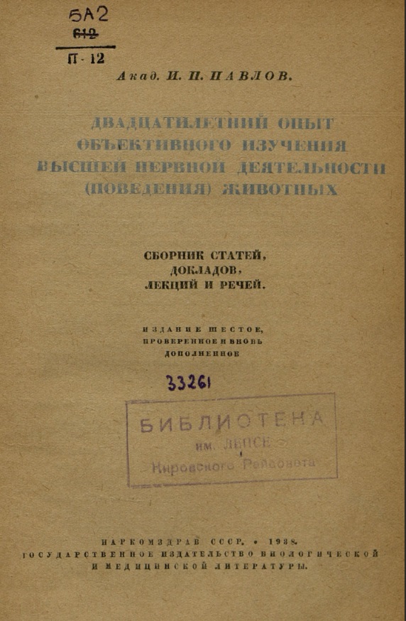Сегодня мы представляем книгу Ивана Петровича Павлова (1849 - 1936) "Двадцатилетний опыт объективного изучения высшей нервной деятельности (поведения) животных: условные рефлексы : сборник статей, докладов, лекций и речей" (1938)/ И. П. Павлов . - 6-е изд., проверен. и доп. - Москва; Ленинград: Биомедгиз, 1938. - 780 с. - Из фонда ЦБС Кировского района (СПб)
