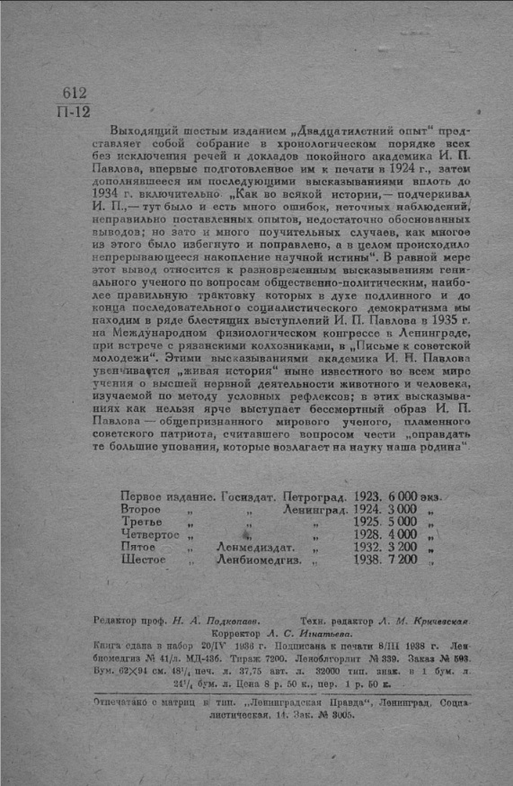 Копия книги Ивана Павлова (1849 - 1936) "Двадцатилетний опыт объективного изучения высшей нервной деятельности (поведения) животных: условные рефлексы : сборник статей, докладов, лекций и речей" (1938) в формате pdf — 452 Мб, в ней 780 страниц.