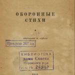 Сборник стихов В. В. Маяковского, посвященных солдатам и матросам. В 1939 году книгоиздательство "Художественная литература" выпустило сборник военных стихов В. В. Маяковского "Оборонные стихи". Первое издание "Оборонных стихов" вышло в Москве в начале 1936 года с предисловием Виталия Примакова. Сборник переиздавался в Москве, Минске, Хабаровске.