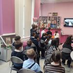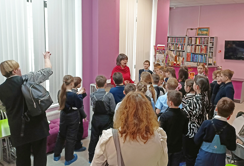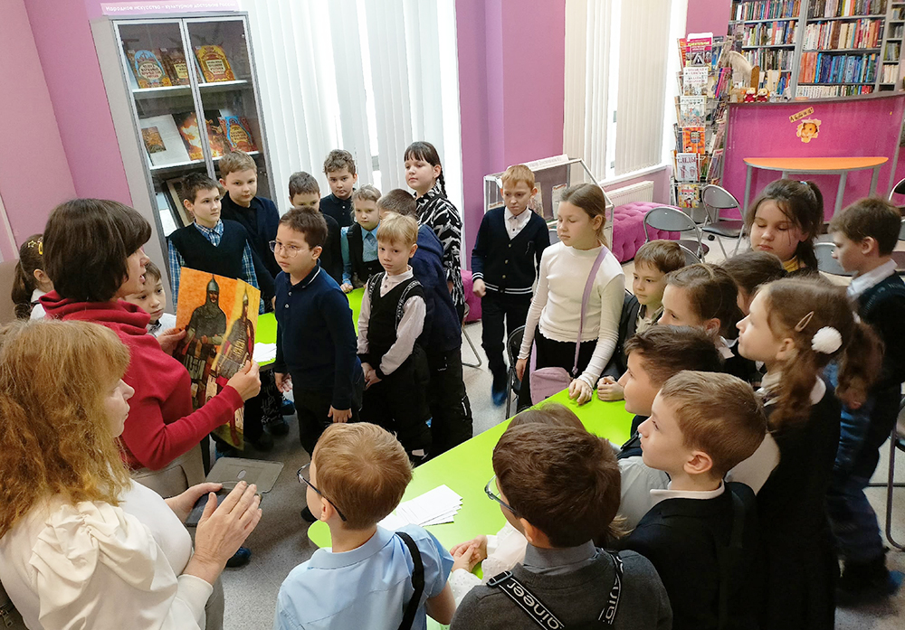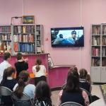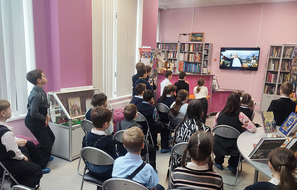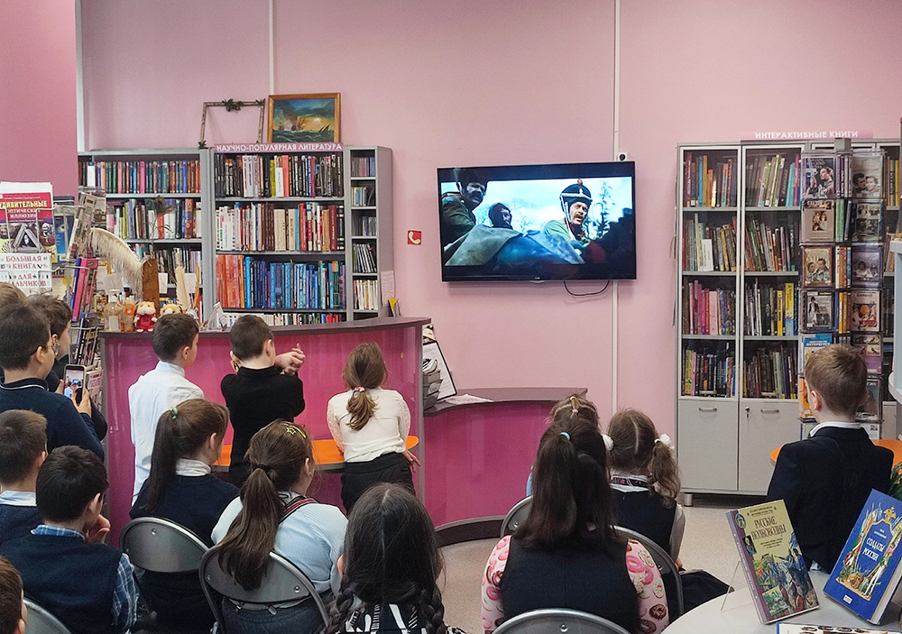 Закончилась праздничная программа просмотром отрывка из мультипликационного фильма "Илья Муромец и Соловей Разбойник" и обзором книжной выставки "На рубежах Отчизны".