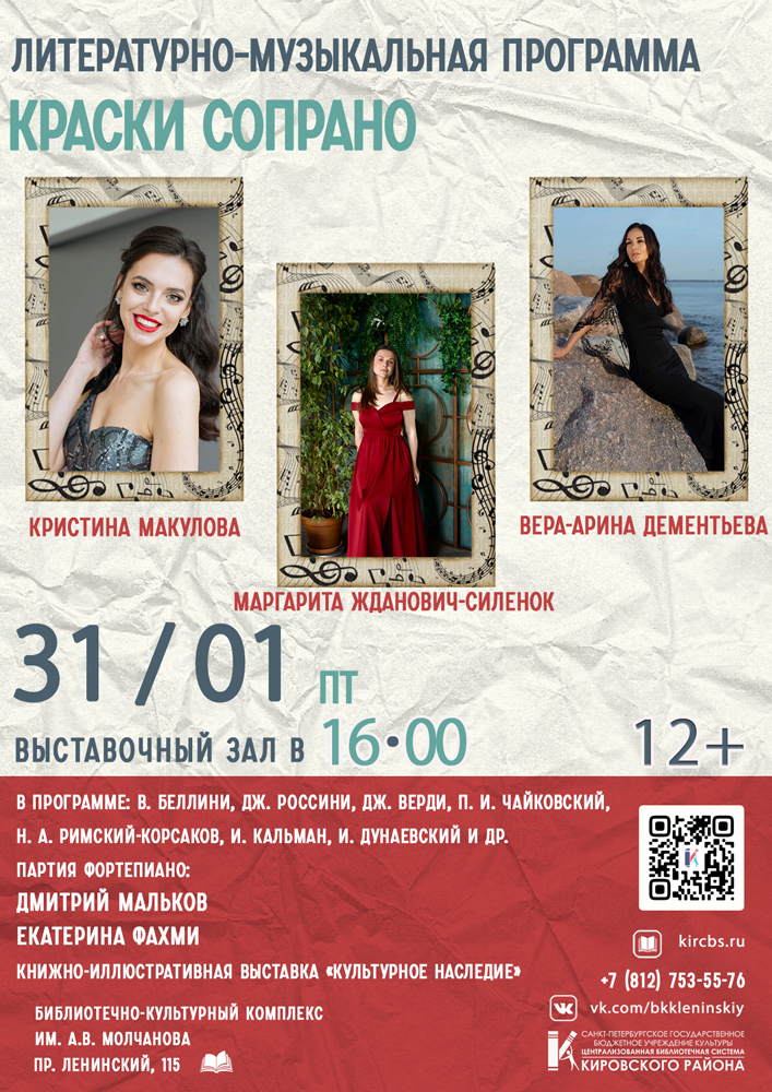 31 января в 16.00 в Выставочном зале Библиотечно-культурного комплекса им. А. В. Молчанова (Ленинский пр., д. 115) состоится Литературно-музыкальная программа "Краски сопрано".