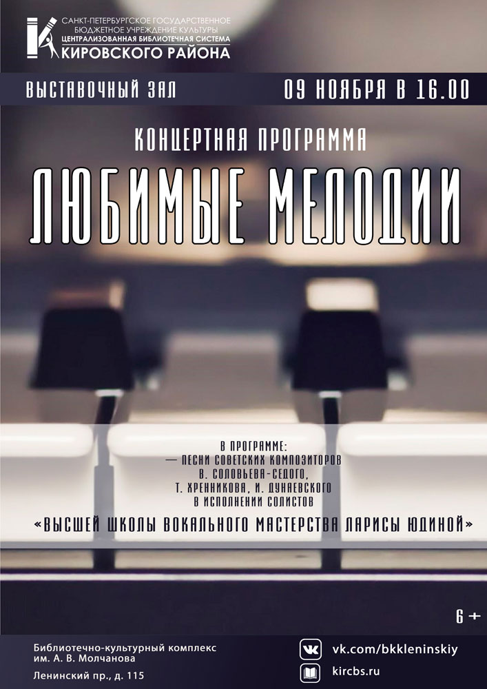 9 ноября в 16.00 в выставочном зале Библиотечно-культурного комплекса им. А. В. Молчанова состоится Концертная программа "Любимые мелодии".