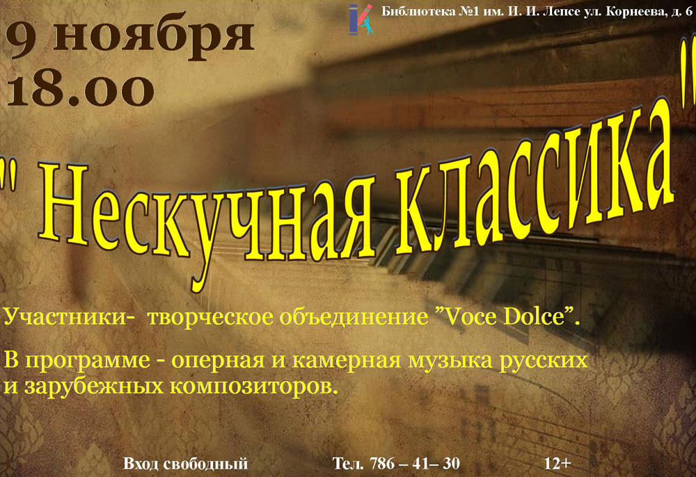 9 ноября 2023 года в 18.00 Библиотека №1 им. И. И. Лепсе приглашает всех желающих на Концертную программу "Нескучная классика".