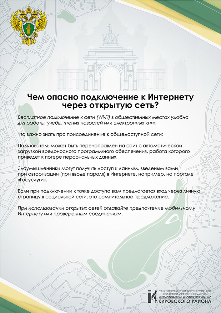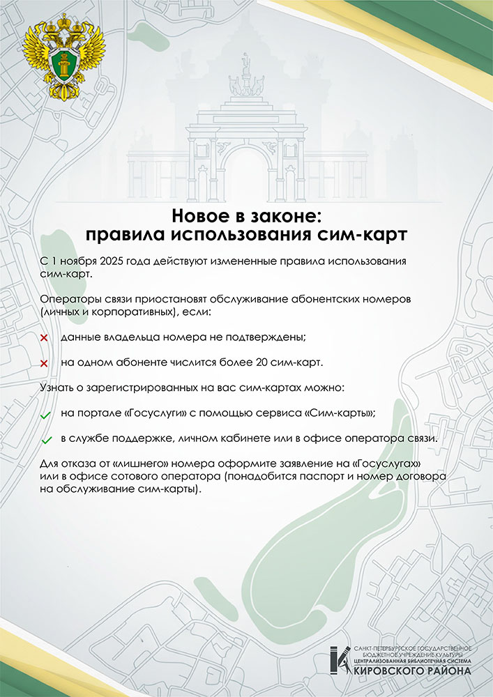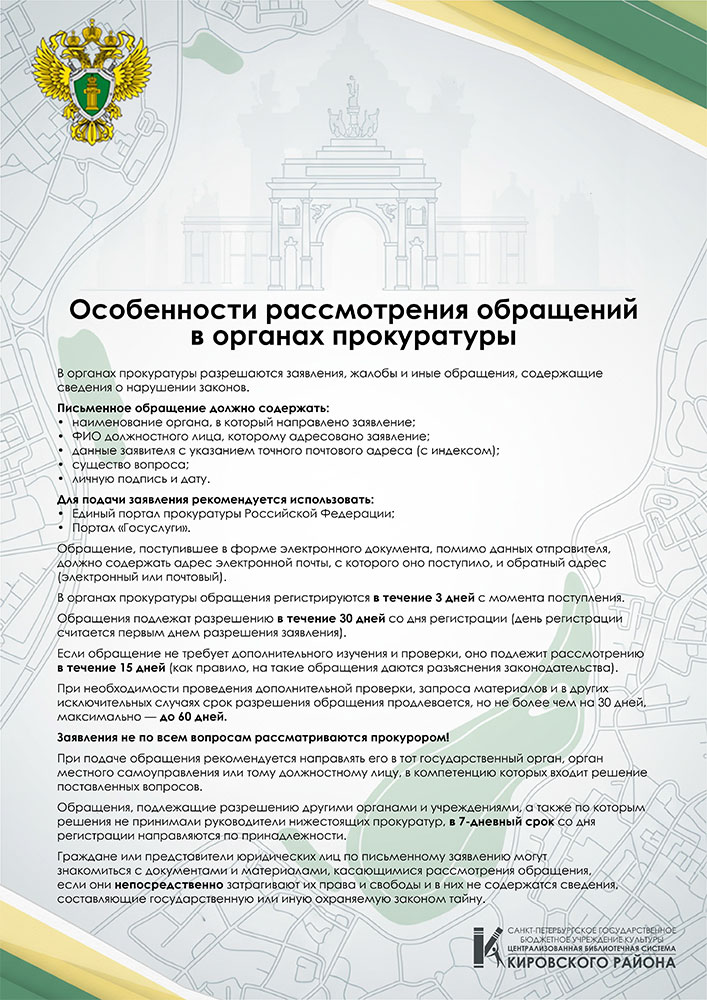 Для того чтобы каждый житель мог уверенно ориентироваться в правовом поле, четко понимал объем своих прав, обязанностей и меру ответственности за те или иные действия, Прокуратура Кировского района Санкт-Петербурга в тесном сотрудничестве с Централизованной библиотечной системой Кировского района реализовала важную просветительскую инициативу. В рамках данной совместной работы были разработаны и подготовлены к распространению специализированные наглядные материалы - тематические плакаты и информационные памятки, адресованные самому широкому кругу жителей не только Кировского района, но и всего Санкт-Петербурга.