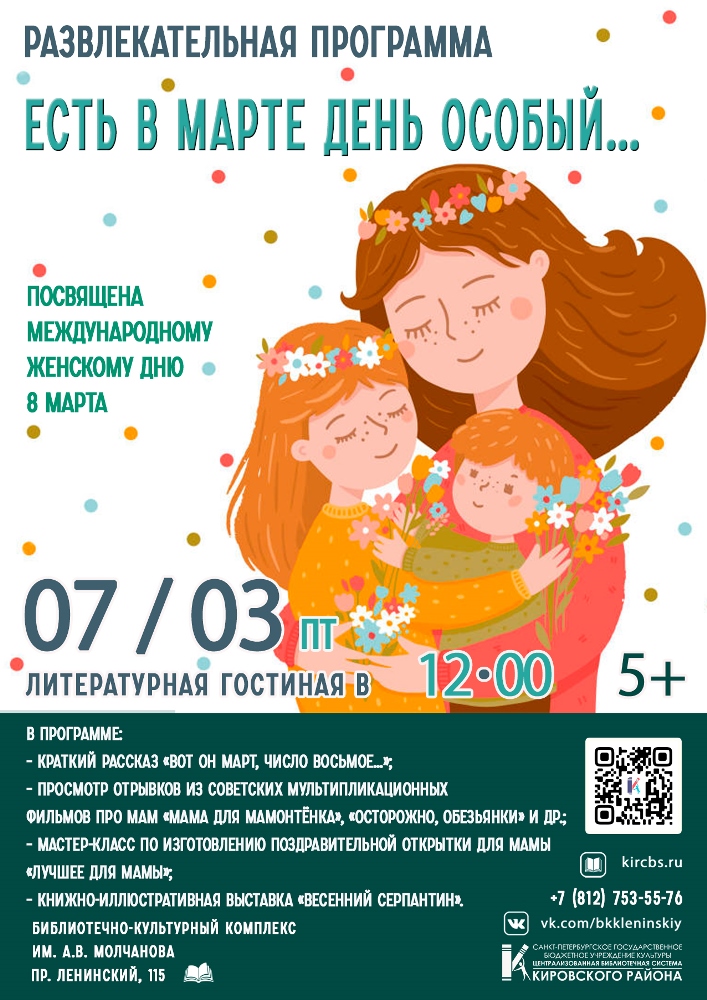 07 марта в 12.00 в Литературной гостиной Библиотеки №4/ Библиотечно-культурного комплекса им. А.В. Молчанова (Ленинский пр., д. 115) состоится развлекательная программа "Есть в марте день особый…"