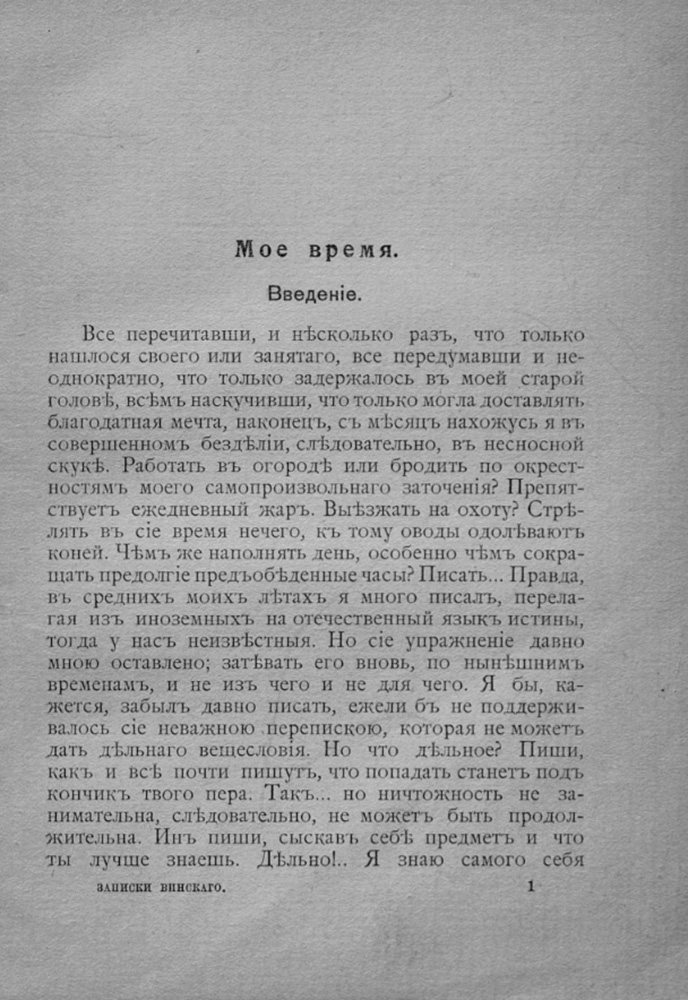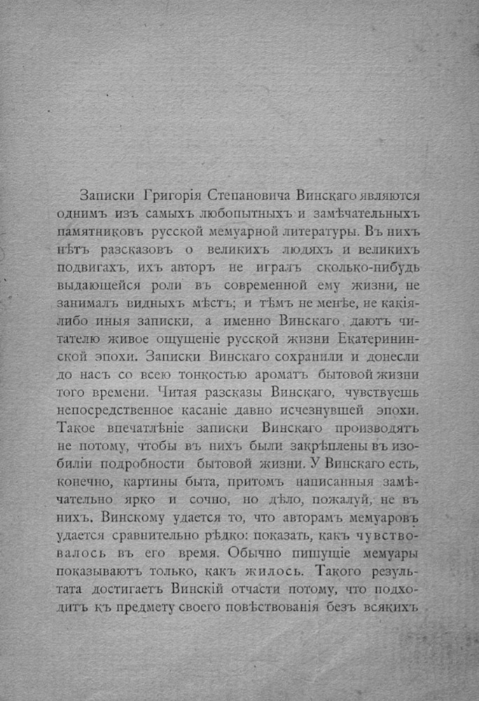 Записки Григория Степановича Винского являются одним из самых любопытных и замечательных памятников русской мемуарной литературы. В них нет рассказов о великих людях и великих подвигах, их автор не играл сколько-нибудь выдающейся роли в современной ему жизни, не занимал видных мест; и тем не менее, не какие-либо иные записки, а именно Винского дают читателю живое ощущение русской жизни Екатерининской эпохи.