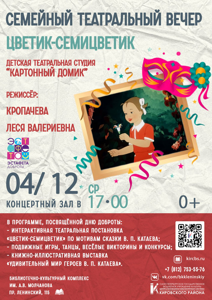 4 декабря в 17.00 в Концертном зале Библиотечно-культурного комплекса им. А. В. Молчанова (Ленинский пр., д. 115) состоится Семейный театральный вечер "Цветик-семицветик".