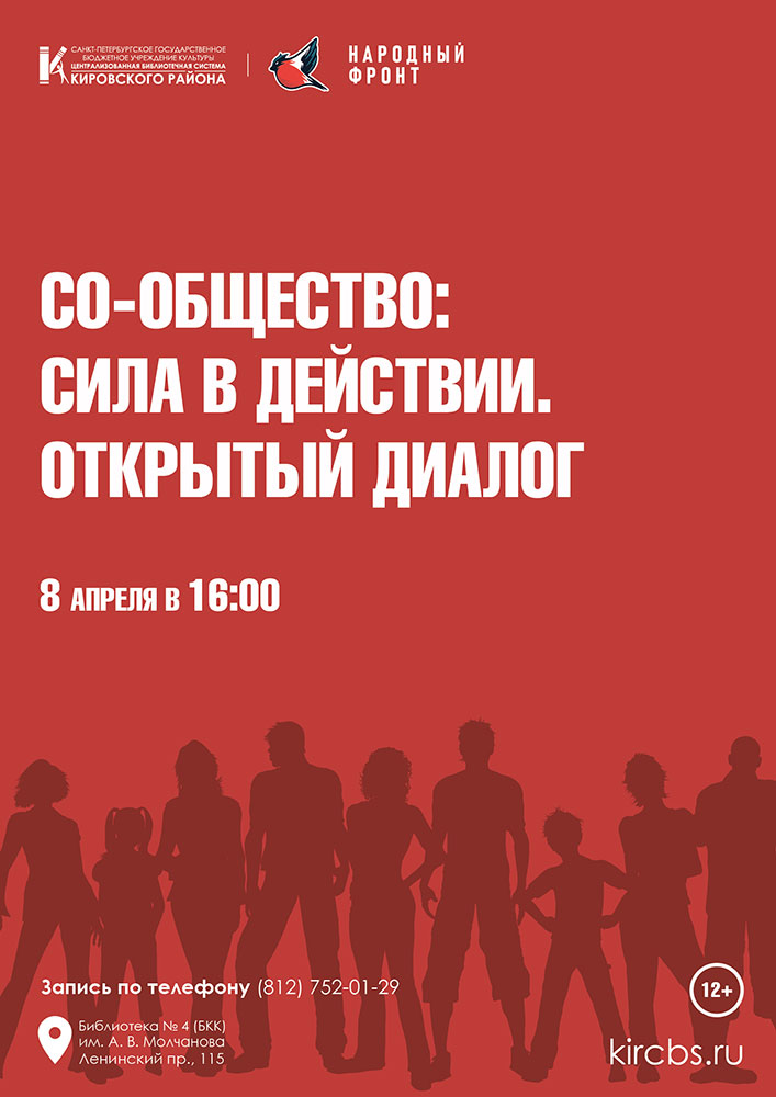 В рамках объявленного Президентом Российской Федерации Года дружбы народов Централизованная библиотечная система Кировского района Санкт-Петербурга совместно с "Молодежкой Народного фронта" запускают проект "Со-общество: сила в действии. Открытый диалог". Эта инициатива создает открытую площадку для прямого разговора с молодежью, позволяя детально узнать о практических возможностях участия в значимых общественных и волонтерских миссиях по всей стране. Первая встреча состоится 8 апреля 2026 года в 16.00 в Библиотеке № 4 (Библиотечно-культурный комплекс ) им. А. В. Молчанова (Ленинский пр., д. 115).