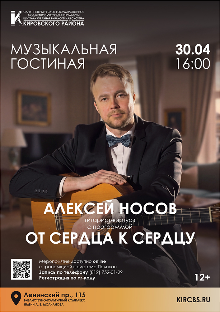 30 апреля 2026 года в 16.00 в концертном зале Библиотеки №4 (Библиотечно-культурного комплекса) им. А. В. Молчанова (Ленинский пр., д. 115) состоится сольный концерт гитариста-виртуоза Алексея Носова с программой "От сердца к сердцу" в рамках проекта "Музыкальная гостиная".